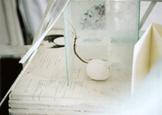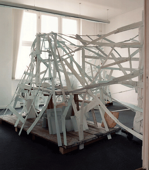 Raumschiff, 1996 Obstkistenholz, Farbe, Mobiliar, Objekte, Texte, Fotografien Installation im Weinhaus Huth, Potsdamer Platz, Berlin Foto: Bernd Borchardt