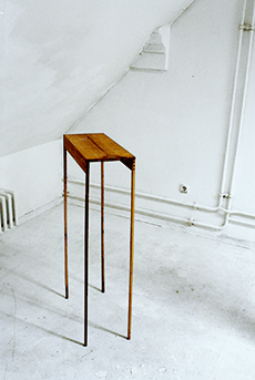 Ein Tisch ist ein Tisch und ein Sockel ist ein Sockel, mehr beide hingegen sind Ablagen. Um den einen versammelt man sich, auf dem anderen werden Objekte präsentiert. Nataly Hockes Tisch ist kein Ort der Versammlung mit seiner Höhe von 1,50 cm, eher ein Ort der Sammlung. Läge die Platte schräg, könnte er als Lesepult genutzt werden, so aber entzieht er sich auch dieser Funktion. Die filigrane Konstruktion des Brückenmöbels, die aus einer Kieferplatte und dem Gestänge eines Faltbootes entstanden ist, erinnert so mehr an den Sockel einer Vitrine, wie sie häufig in Naturkundemuseen anzutreffen sind, wäre also in diesem Sinne als Ort einer Sammlung zu verstehen. Ohne Haube und vielmehr noch ohne Präsentationsobjekt wird der Sockel zu einer Frage der Präsentation sowie ihrer Formen selbst. Damit aber wird das Objekt, das der Präsentation dient, zum Objekt der Präsentation. Es wäre also ein Objekt des Entzugs, das den Modus des Präsentierens selbst zum Gegenstand macht.